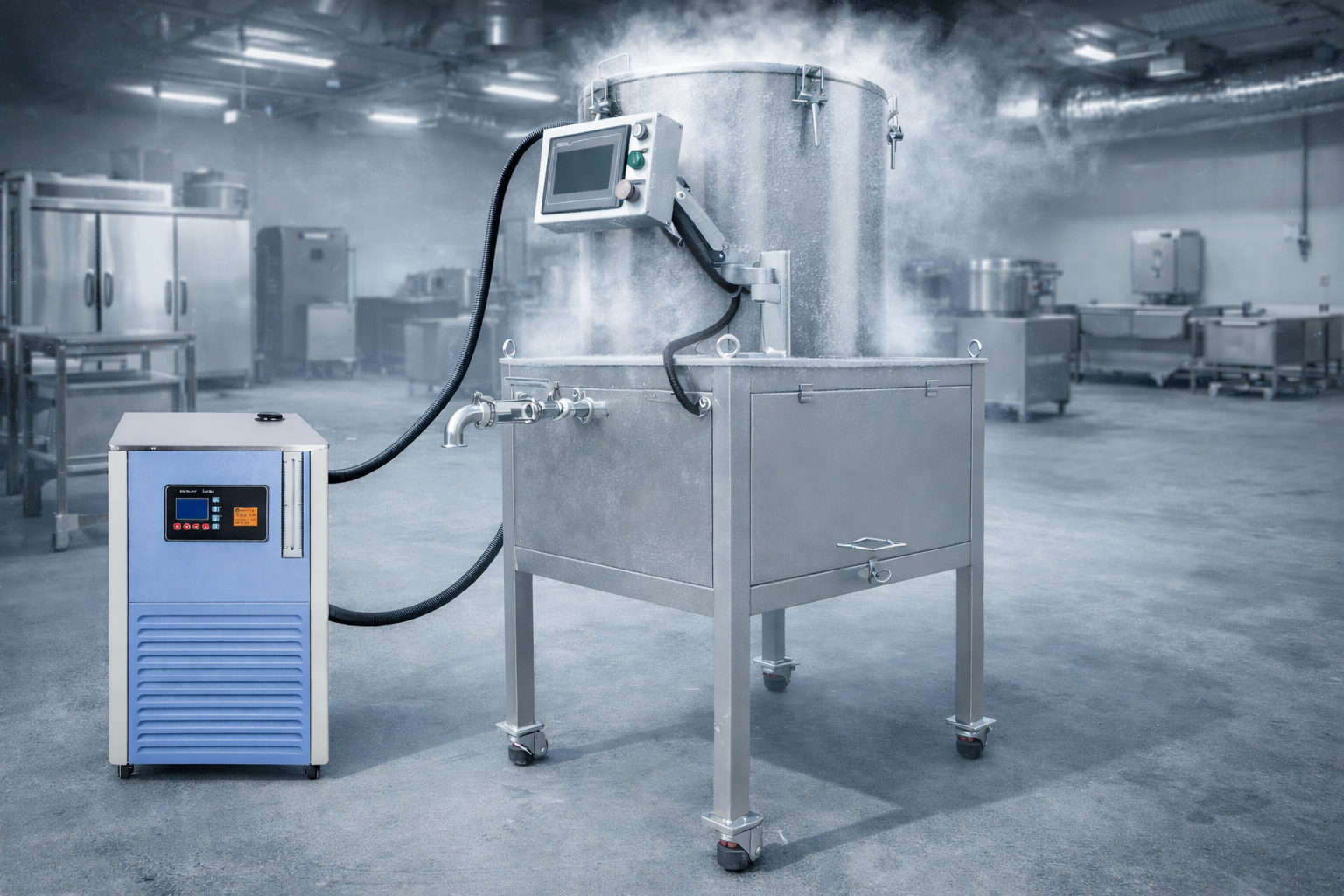 configure a chiller with cold-water recirculation and precise temperature control—dramatically reducing ice usage, or eliminating the need for ice altogether.